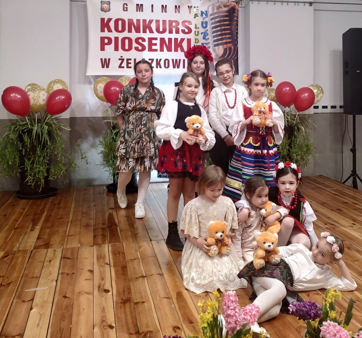 W piątek 11.04. 2025r. wybrane na drodze eliminacji szkolnych, uczennice klas 0 ( Adrianna Płuciennik, Helena Waszak, Nina Wałęsiak), I (Zuzanna Siuda) , II (Maja Sowińska , Lena Olszewska) oraz IV ( Barbara Kurczbuch, Pola Gabrysiak, Martyna Janicka) wzięły udział w Gminnym Konkursie Piosenki "Na ludową nutę". Dziewczynki godnie reprezentowały naszą szkołę. Uczennice ukazały bogactwo polskiej muzyki ludowej w formie prezentacji wokalnej. Dzięki pięknym, pomysłowym i barwnym strojom miło się słuchało, ale również oglądało występy. Na widowni kciuki trzymali rodzice oraz Pani Edyta Waszak. Konkurs cieszył się dużym zainteresowaniem, jury miała naprawdę ciężką decyzję, by zdecydować, kto wygra. Adrianna Płuciennik z klasy 0 zajęła III miejsce ( w kategorii - przedszkolaki). Maja Sowińska uczennica klasy II otrzymała I wyróżnienie ( w kategorii- uczniowie klas I-III szkół podstawowych). Gratulujemy i życzymy dalszych sukcesów. Wszyscy uczestnicy otrzymali dyplomy uczestnictwa oraz upominki. Laureaci otrzymali dyplomy i nagrody oraz zaprezentują swoje utwory na festynie z okazji " Dnia dziecka" oraz na Gminnych Dożynkach. Bardzo się cieszymy, że "Ludowa nuta" przypadła do gustu naszym uczennicom.