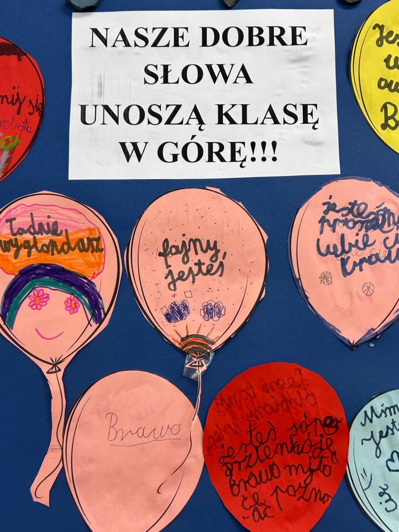 Z wszystkich baloników powstał wspólny plakat pod hasłem: „Nasze dobre słowa unoszą klasę w górę” – symbol pozytywnych emocji i wsparcia, jakie uczniowie mogą sobie nawzajem dawać każdego dnia.