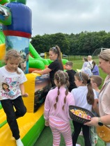 Niewątpliwą atrakcją dnia były również dmuchańce – kolorowe zamki i zjeżdżalnie, które dostarczyły najmłodszym uczestnikom mnóstwa śmiechu i beztroskiej zabawy. Ich obecność sprawiła, że każdy uczeń – niezależnie od wieku – znalazł coś dla siebie.