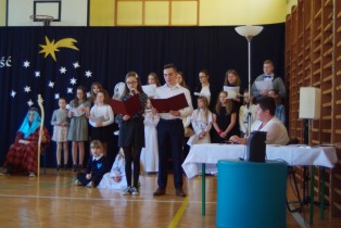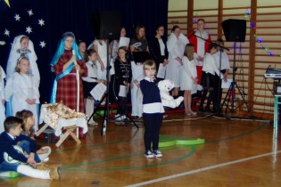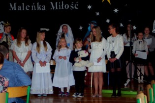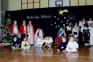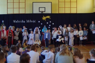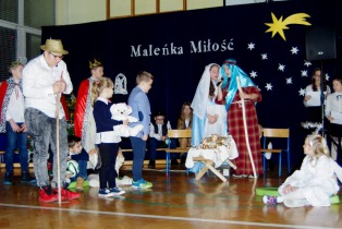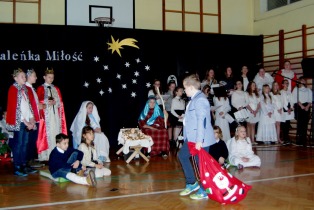 Tego wieczoru, zazwyczaj rozgadani i rozbawieni uczniowie, w ciszy i skupieniu, z anielskimi uśmiechami na buziach, oczekiwali na swój świąteczny występ. Poprzedziło go powitanie gości przez Panią Dyrektor Magdalenę Mikołajczyk słowami: „ Maleńka Miłość niech zrodzi się w każdym z nas, w każdej rodzinie, w naszej szkole. Dziękuję przyjaciołom szkoły, sponsorom, rodzicom za wszelkie dobro”. W klimat zbliżających się świąt wprowadziły słowa ks. Grzegorza Mituły, przypominające historię i rangę opłatka, którym się dzielimy w Wigilię Bożego Narodzenia oraz odczytanie fragmentu z Pisma Świętego. Następnie wszyscy mieli okazję złożyć sobie życzenia, które wypływały z głębi serca. W tle Trzej Mędrcy ze Wschodu przestępowali już niecierpliwie z nogi na nogę, w oczekiwaniu na jasełka sprawdzając, czy aby złoto, kadzidło i mirra nie uległy zniszczeniu.