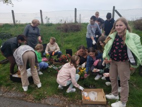Laureatom gratuluję, a wszystkim uczestnikom dziękuję za udział w konkursie. Uczniowie klas 0-8 przynieśli sadzonki roślin do posadzenia w donicach przed szkołą. Wybrani przedstawiciele uczniów klasy 4a oraz klasy 7a pod opieką pani Moniki Raniś i Izabeli Śmieszniak posadzili kwiaty przed głównym wejściem do budynku.