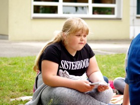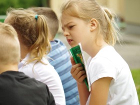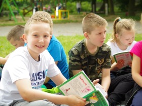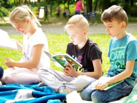 Trzecia klasa czyta na trawie