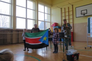 Była to bardzo ciekawa lekcja kulturoznawcza, ponieważ Pan Tomasz Zawal jako wolontariusz pracujący w Kamerunie i Sudanie Północnym opowiedział o trudnościach życia codziennego w Afryce, o problemach z wodą i chorobach nękających mieszkańców tej części świata. Uczniowie mieli szansę obejrzeć bardzo interesującą prezentację i krótkie filmiki o obyczajach, nawykach żywieniowych i kulturze mieszkańców Sudanu, którzy żyją w bardzo trudnych warunkach. Dowiedzieli się również, w jakie zabawy bawią się ich rówieśnicy w Afryce i czy edukacja jest tak szeroko dostępna jak u nas. Czasami warto poznać trudne życie innych, by docenić to co nam oferuje życie na co dzień!!! Dużą ciekawostką okazały się także, tradycyjne stroje noszone przez kobiety i mężczyzn z Sudanu ( zaprezentowane przez Pana Tomasza) i własnoręcznie wykonane przez dzieci zabawki; okazuje się, że dzieci afrykańskie potrafią zrobić „coś z niczego” i są bardzo kreatywne.