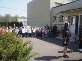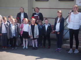 Uczniowie klasy V przybliżyli wszystkim to ważne i znaczące historyczne wydarzenie, przygotowując montaż słowno – muzyczny. W śpiew piosenki „Witaj maj, 3 maj” włączyli się wszyscy uczniowie oraz pracownicy szkoły, a echo ich niosło się po całej okolicy.