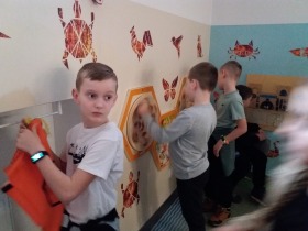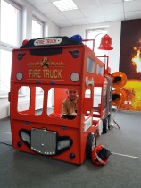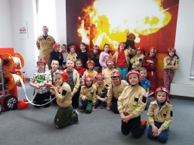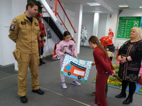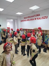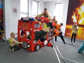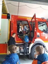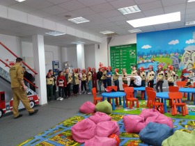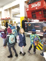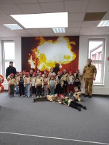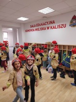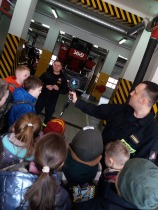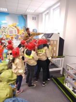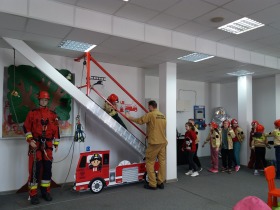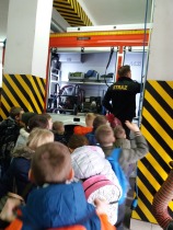 Kolejnym punktem naszej wycieczki była wizyta w Państwowej Straży Pożarnej. Uczniowie naszej szkoły odbyli lekcję w salce edukacyjnej. Była to okazja do pogadanki na temat bezpiecznego zachowania w domu i szkole. Podczas zajęć dzieci zakładały mundury i hełmy strażackie. Wcieliły się w rolę strażaków i brały czynny udział w akcji ratowania kota. W czasie wizyty strażacy zaprezentowali dzieciom i opiekunom pojazdy pożarnicze, sprzęt ratowniczy i gaśniczy. Obserwowaliśmy pokazowy zjazd po ześlizgu. Na koniec odwiedzin dzieci przekazały strażakom podziękowania i życzenia w formie plastycznej.